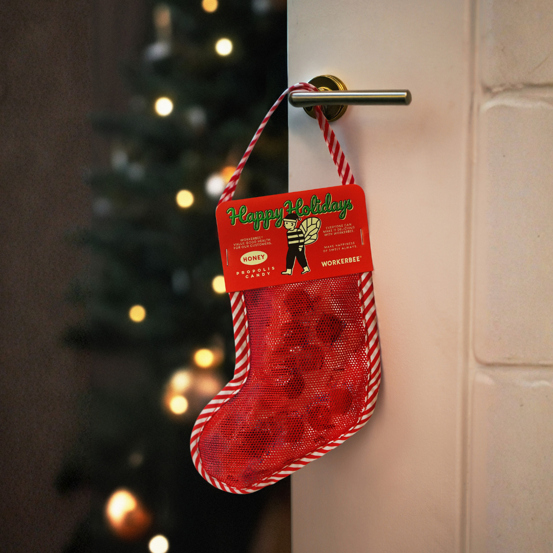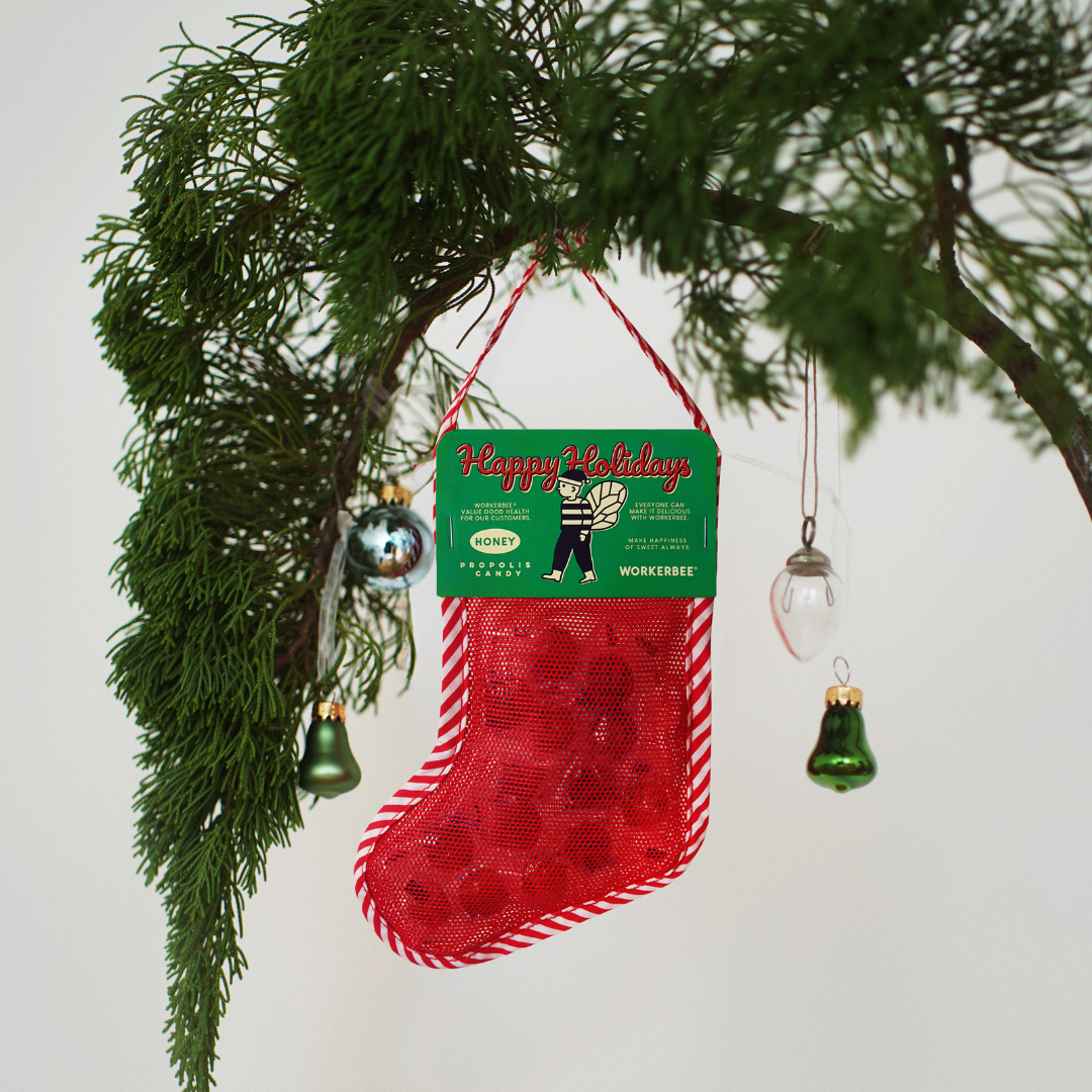 クリスマスの靴下型のバッグにはちみつプロポリスキャンディが詰まった
